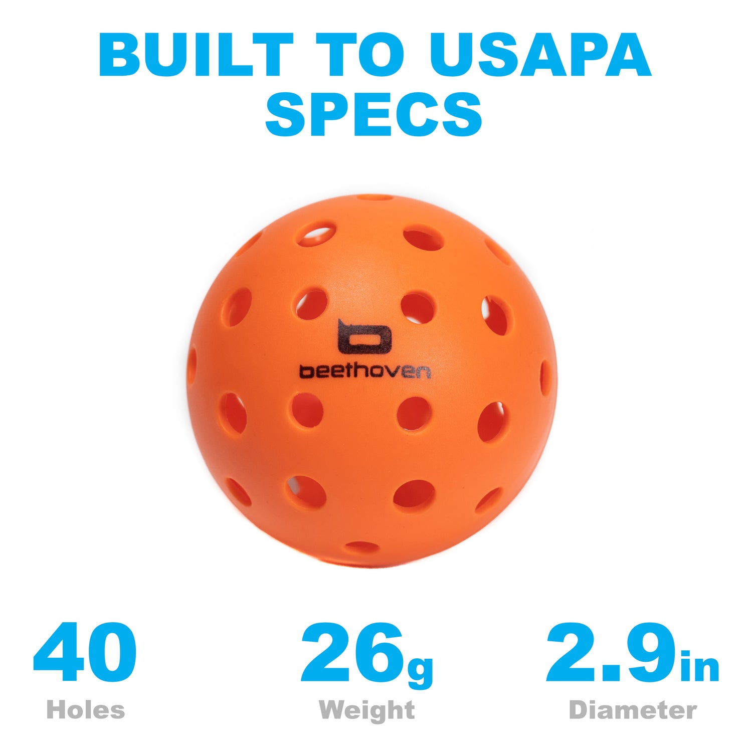 Beethoven Bird indoor and outdoor pickleball balls meet USAPA ball specifications, are durable and of high quality, have exceptional accuracy and bounce, perform well even in windy conditions, are very easy to see even in low light due to bright orange color, and are available to you at an unbeatable price.